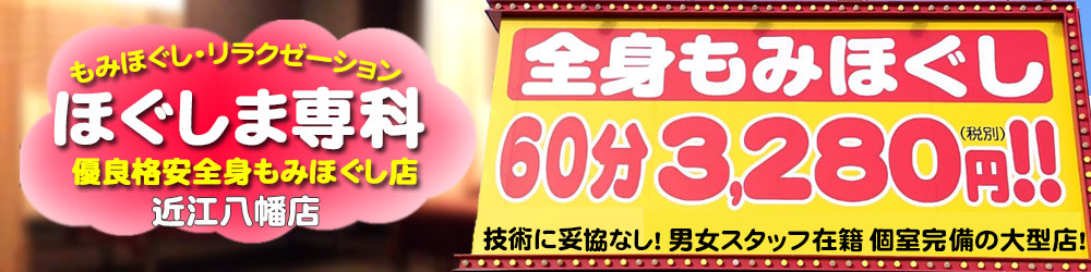 『ほぐしま専科 近江八幡店』では、お客様の財布に優しい価格設定で、ご満足いただけるサービスを提供しております。「全身もみほぐし」「足裏もみほぐし」「全身・足裏ハーフ」と3種類のコースから、お客様のニーズに答える為、時間設定を細かく提供しています。 他店の場合、「全身もみほぐしコース」は、手もみ時間が長めで値段も高めなケースが多いです。しかし当店では、なんと「15分で1078円」というお手軽プランをご用意しております。気軽にボディケア・もみほぐしを受けたい方のほか、時間がないという方にも便利です。是非ご利用くださいませ♪ また、お仕事帰りの方にもご利用いただけるよう、営業時間を長めにしております。忙しいお客様のご都合に合わせてご来店頂けます。朝は10時から夜は深夜25:30まで営業中(24時受付まで)地元で一番店になれるよう、スタッフ一同、日々施術を磨いております。